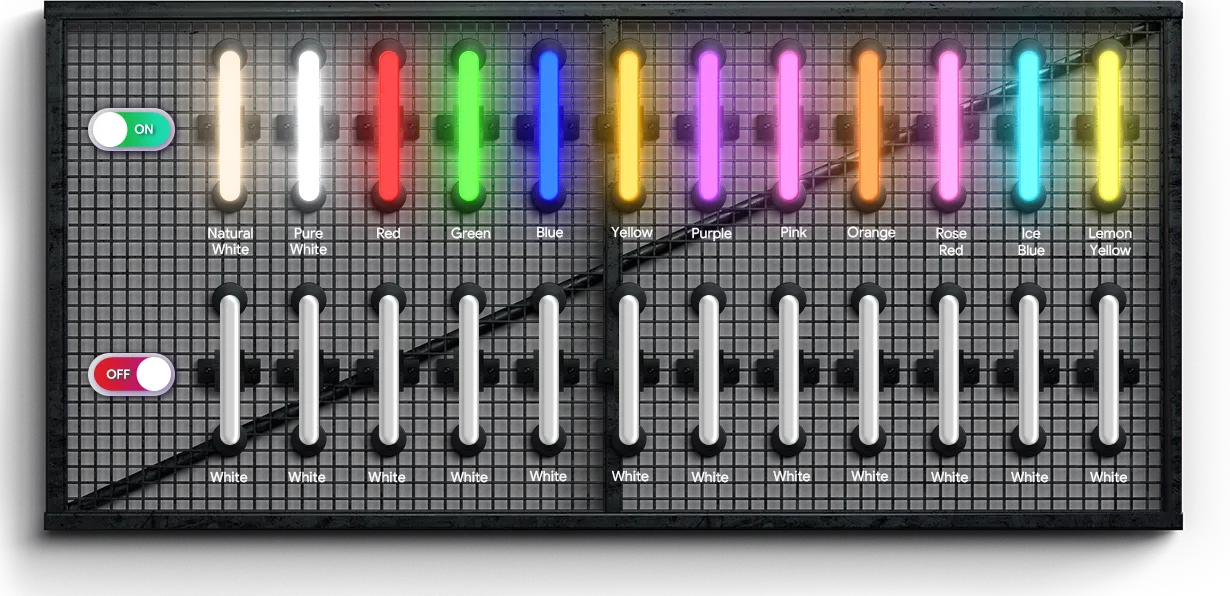 Når skiltet er slukket, er rørene stadig farvede, og farven er mere intens, når den er tændt.